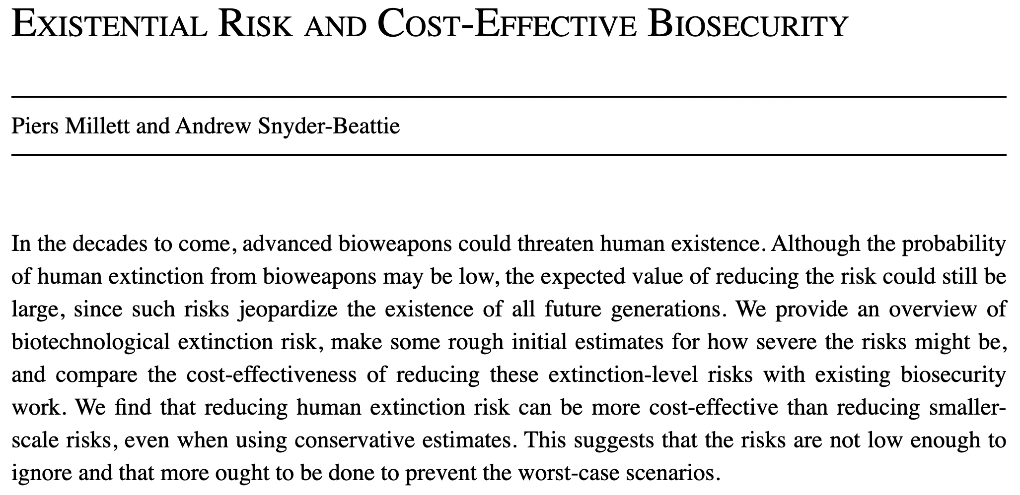 Millett and Snyder-Beattie, “Existential risk and cost-effective biosecurity“
